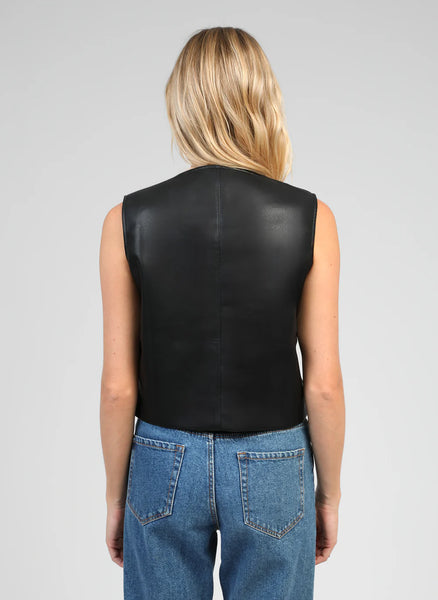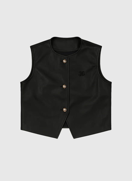 Add a bold, feminine touch to your look with this straight-cut vest in smooth faux leather. Designed with a round neckline, statement jewel buttons, it combines glamour with modern edge. Perfect to layer over a blouse or wear solo for an elevated, effortless style.