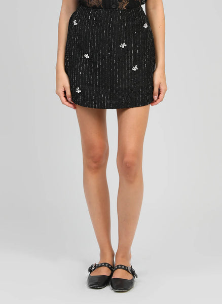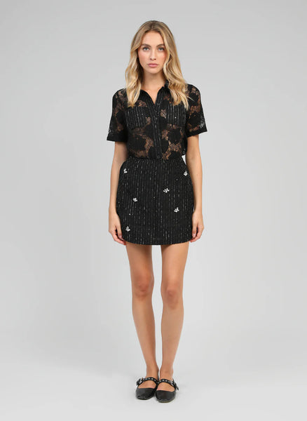 Chic and sophisticated, this two-piece set features a delicate lace shirt with contrast collar and button detailing, paired with a fitted textured skirt adorned with rhinestone and bead embroidery. The elastic back waist ensures comfort, while the refined design makes it perfect for day-to-night wear.